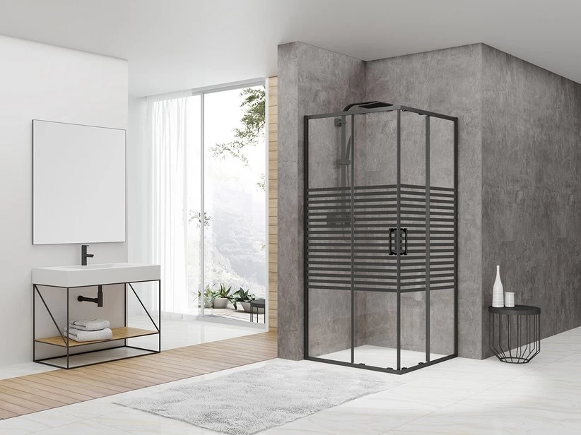 Cristallo spessore 6mm. trasparente con serigrafia a bande nere opache orizzontali esterne al box doccia