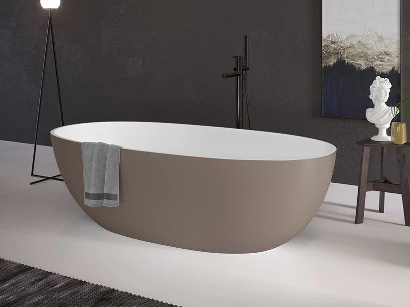 VIRGO vasca free-standing cm L170xP82xH53 senza troppo pieno e senza fori per rubinetteria. Piletta click clack inclusa. Senza piedini regolabili (necessita la realizzazione di un pozzetto centrale) – realizzata in Technosolid Bicolor TORTORA FOSSIL/interno BIANCO OPACO